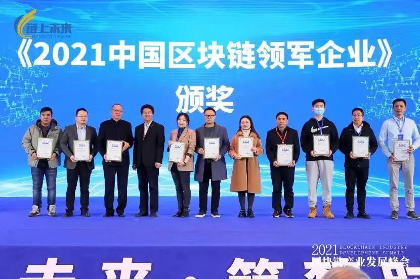 2021中国区块链领军企业(“名企”)证书由链上未来·2021区块链产业开展峰会组委会、赛迪(青岛)区块链实验室联合颁发。